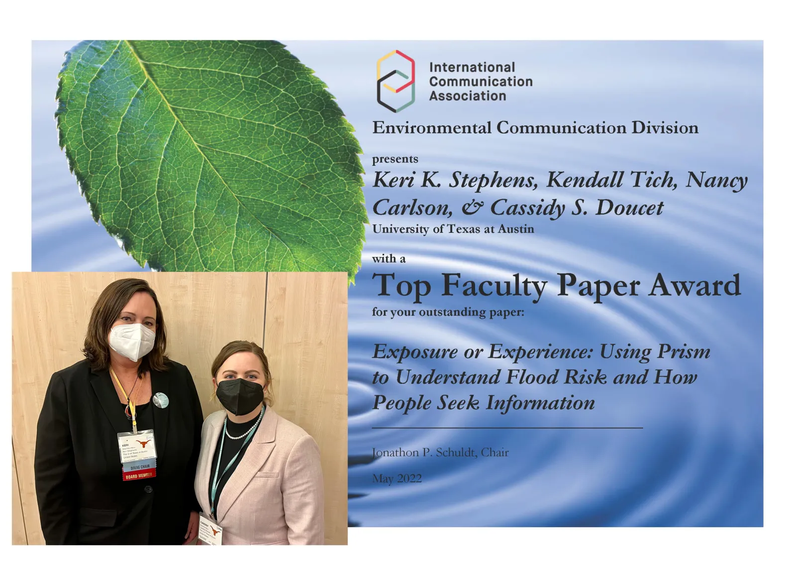 A number of faculty and graduate students received top paper honors at the conference. Shiv Ganesh and Sam James (along with Cynthia Stohl) were on the Top 4 Paper Panel in the Organizational Communication Division for their paper Generational Shifts: The Emergence of Visibility in Globalization Research. Keri Stephens, Kendall Tich, Nancy Carlson, and Cassidy Doucet won a Top Paper Award from ICA’s Environmental Communication Division for their paper Exposure or Experience: Using PRISM to Understand Flood Risk and how People Seek Information. Nik Palomares and program alums John Banas and Steve Rains were among the coauthors on a top paper panel in the Communication and Technology Division for their work When Machine and Bandwagon Heuristics Compete: Understanding Users’ Response to Conflicting AI and Crowdsourced Fact-Checking.